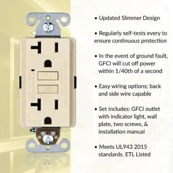 - 10-pack, each pack includes (1) 20 Amp, 125-Volt GFCI duplex outlet, (1) wall plate, (2) screws, installation manual, stickers
