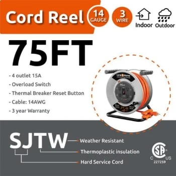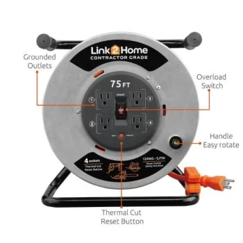 - Power Reel: Csa Certified 75 Ft Cord Reel 12awg Sjtw Cable (4) 120v Outlets On/Off Switch With Power Light Inductor 3-Year Warranty Cord Locking System Heavy-Duty High Visibility Outdoor Extension Cord