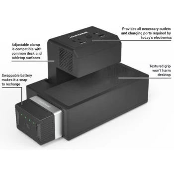 - The Rechargeable Power Stations Clamp Onto Desks And Tabletop Surfaces Up To 1.5″ Thick