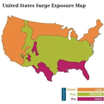 - Surge exposure map correlating storm frequency and intensity with increasing FirstSurge capacities; any FirstSurge will protect in all regions, but selecting the recommended surge current capacity increases robustness to ensure lasting protection